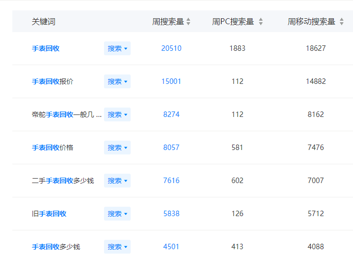現(xiàn)在手表回收依然很火,我們可以先來(lái)看下數(shù)據(jù),這個(gè)是我用工具挖掘出的需求。