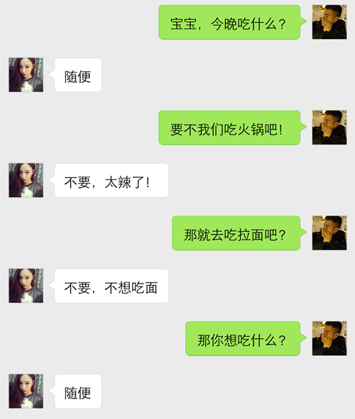 很多兄弟會遇到這樣一種情況,不管是吃飯還是買東西,問女生的時候,女生老說“隨便”,但當我們做出選擇后,往往又會遭到女生的埋怨,這種頭疼的情況,我相信很多兄弟都不知道如何應對?
